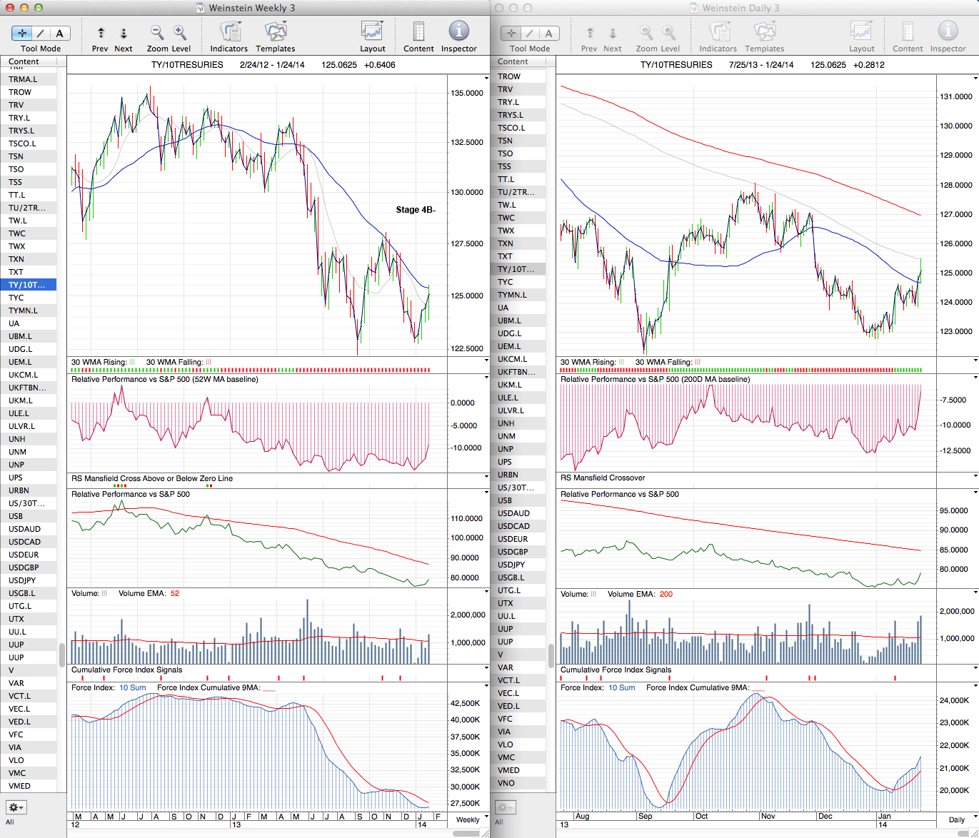 Note the move in the VIX to the top of the relative performance rankings and the 30 year Treasuries change in status to early Stage 1A.