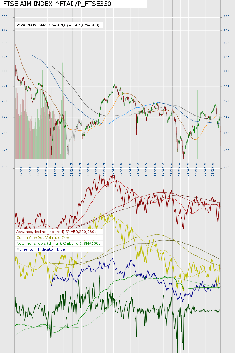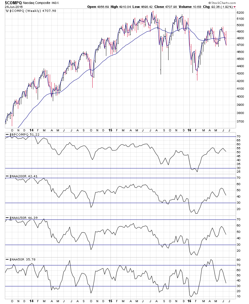 I'm still away on holiday, so just a quick update this week. Looks like the volatility from the UK referendum has put the major US indexes inline with their most recent swing lows again, within their Stage 1 ranges, and the breadth has weakened with a number of bear confirmed signals in the percentage of stocks above their MA's in various timescales. So MA breadth moves to bearish in the short term. The medium and long term breadth is still in the upper half of the range however, but they weakened heavily last week.