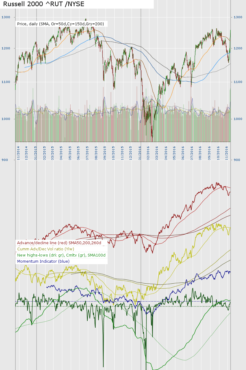 The effective volume breadth charts from http://www.effectivevolume.com show some interesting data from last week with a huge positive move in volume from large players in the Russell 2000 ETF. So on that data it looks like the institutional traders think that small caps are the place to be from the election result, as they are clearly favouring the IWM ETF over the SPY and QQQ.