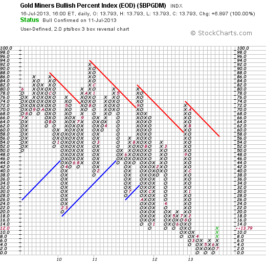 The Gold Miners Bullish Percent Index moved to Bull Confirmed status after giving a triple top P&F breakout signal from the bottom of the range.
