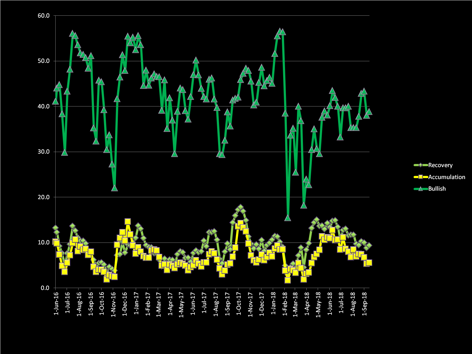 Quick description of the indicator: Sample is the same as for the Survey (2287 stocks). Stock classification is done as per Chuck Dukas's TrendAdvisor Diamond described in his book (see attached TrendAdvisor Diamond). Stocks in bullish, accumulation and recovery phases are considered healthy and cumulatively plotted as an oscillator, same as in the Survey. Those in warning, distribution and bearish phases are considered technically unhealthy.