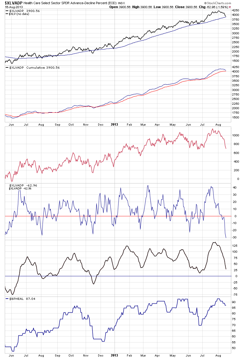 I've used the same setup as on the NYSE Advance Decline alternate measures chart that I show, but I've also included the bullish percents for each sector at the bottom of each chart. Below is the charts:
