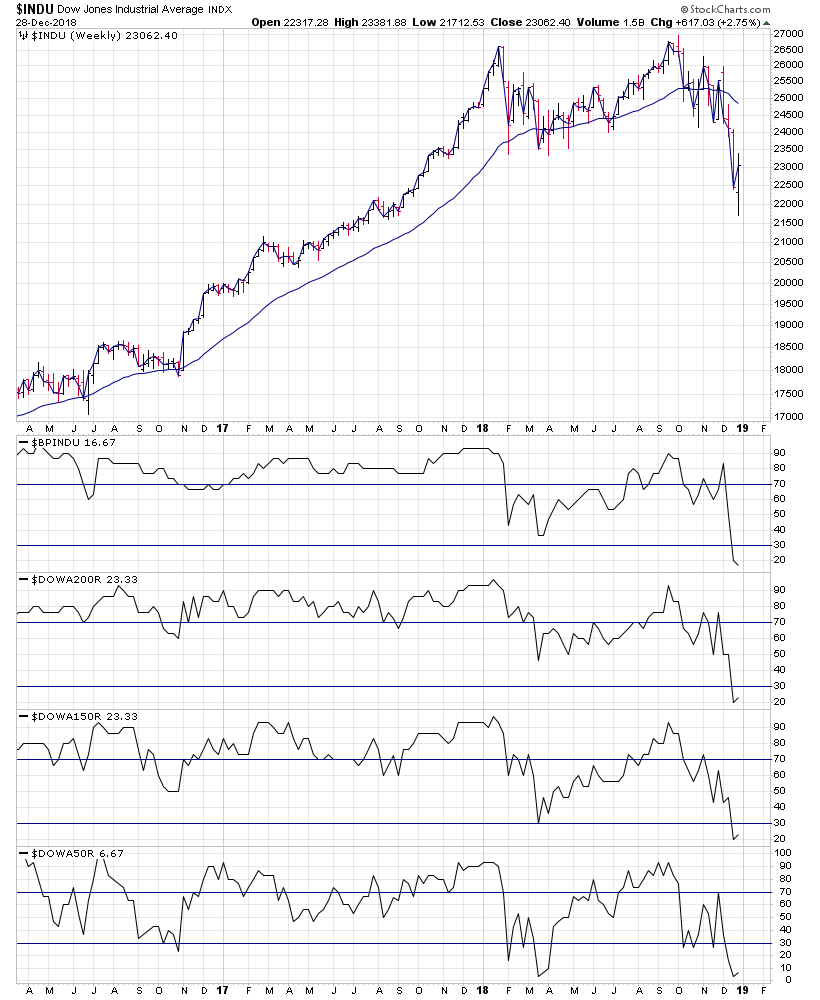 Note: Although the seasonal so called Santa rally occurred this week as defined by the stock traders almanac, as occurring in the last week of December through the first two trading days in January. The major market indexes remain around 10% below their 30 week moving averages in Stage 4 to end the year and start 2019.