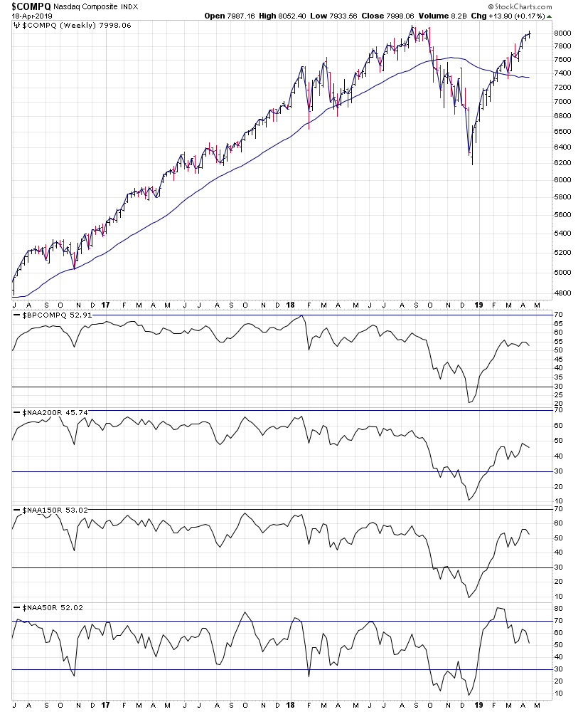 Here's the weekly overview charts of the NYSE, Nasdaq, S&P 500, DJIA & S&P 600 small caps with their US Bullish Percent and Moving Average Breadth.