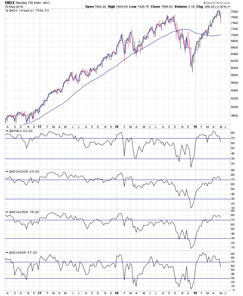 Below is the Percent of Stocks Above their 150 Day Moving Average table in each sector, which is ordered by overall health. Also attached is the visual diagram of the 9 sectors and the two major exchanges that make up the sectors that shows a snapshot of the overall health of the US market.