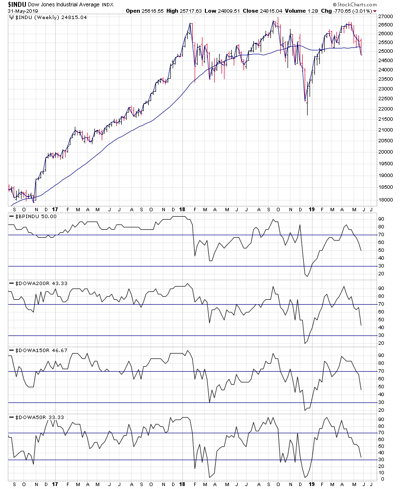 Here's the weekly overview charts of the NYSE, Nasdaq, S&P 500, DJIA & S&P 600 small caps with their US Bullish Percent and Moving Average Breadth.