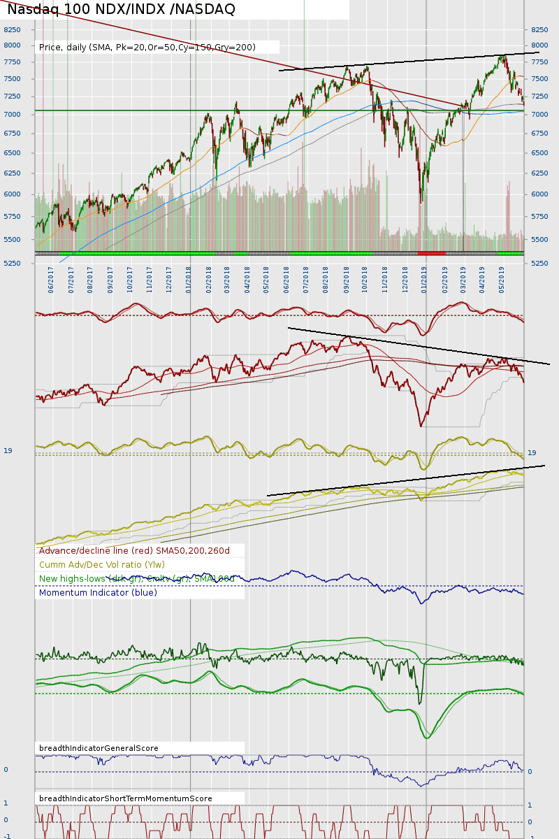 This illustrates the mid and small caps having broke support but the the large caps are not quite there yet. I wonder if the low could go as low as the previous one. However, I have also drawn trendlines on the price and advance / decline and advance / declining volume. If I have this right, which could be debatable, then in the longer term things might be positive? But the prices are making lower highs. This is over a six monthly period, given my charts are daily, will this hold over such a period? Worth also showing the NASDAQ100 against its breadth, its price trendline slopes up, its A/D falls, and A/D volume is rising.
