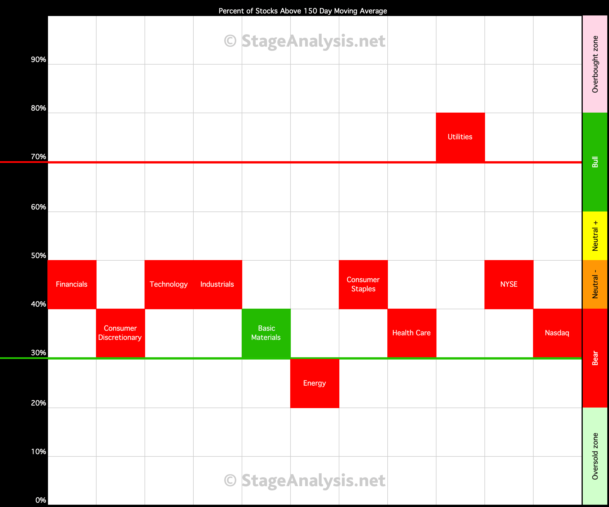 Below is the Percent of Stocks Above their 150 Day Moving Average table in each sector, which is ordered by overall health. Also attached is the visual diagram of the 9 sectors and the two major exchanges that make up the sectors that shows a snapshot of the overall health of the US market.