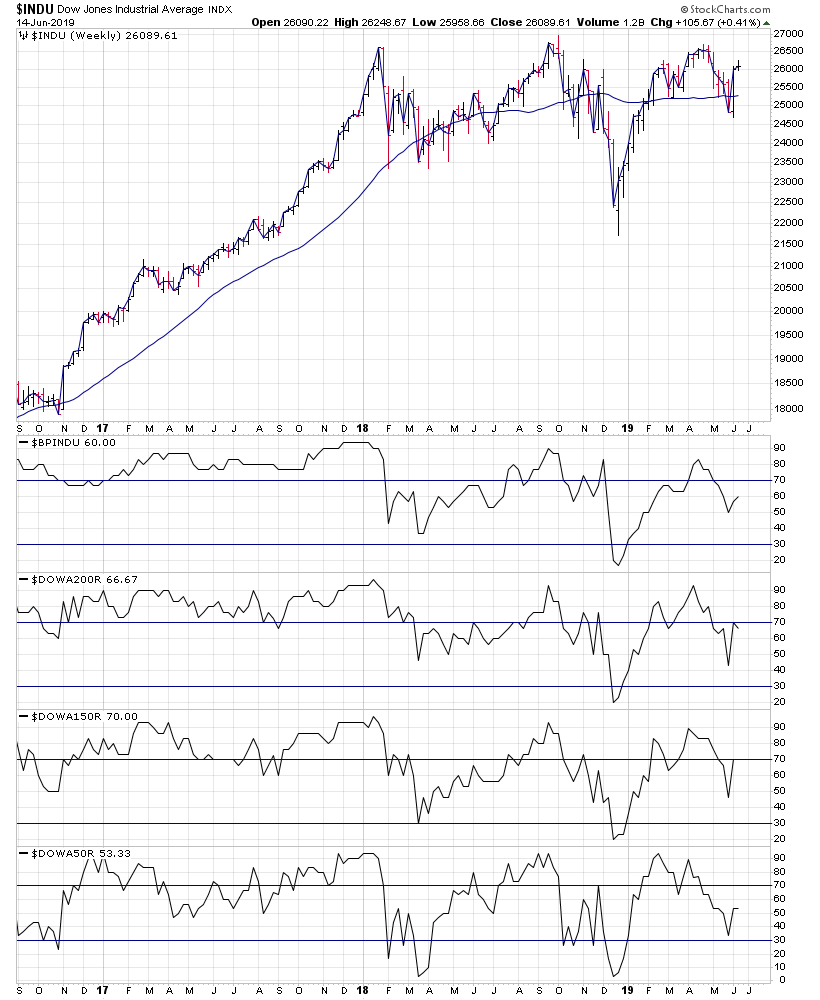 Here's the weekly overview charts of the NYSE, Nasdaq, S&P 500, DJIA & S&P 600 small caps with their US Bullish Percent and Moving Average Breadth.