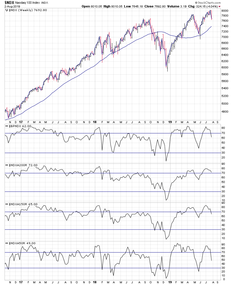 Here are the weekly overview charts of the NYSE, Nasdaq, S&P 500, DJIA & S&P 600 small caps with their US Bullish Percent and Moving Average Breadth.
