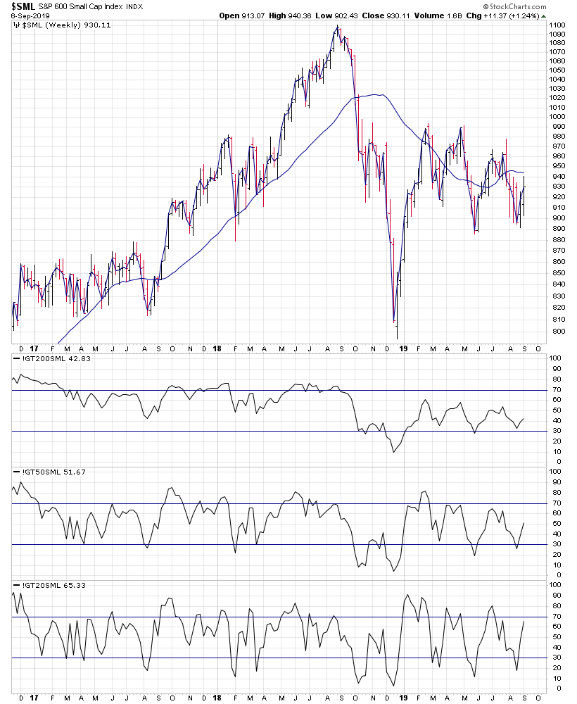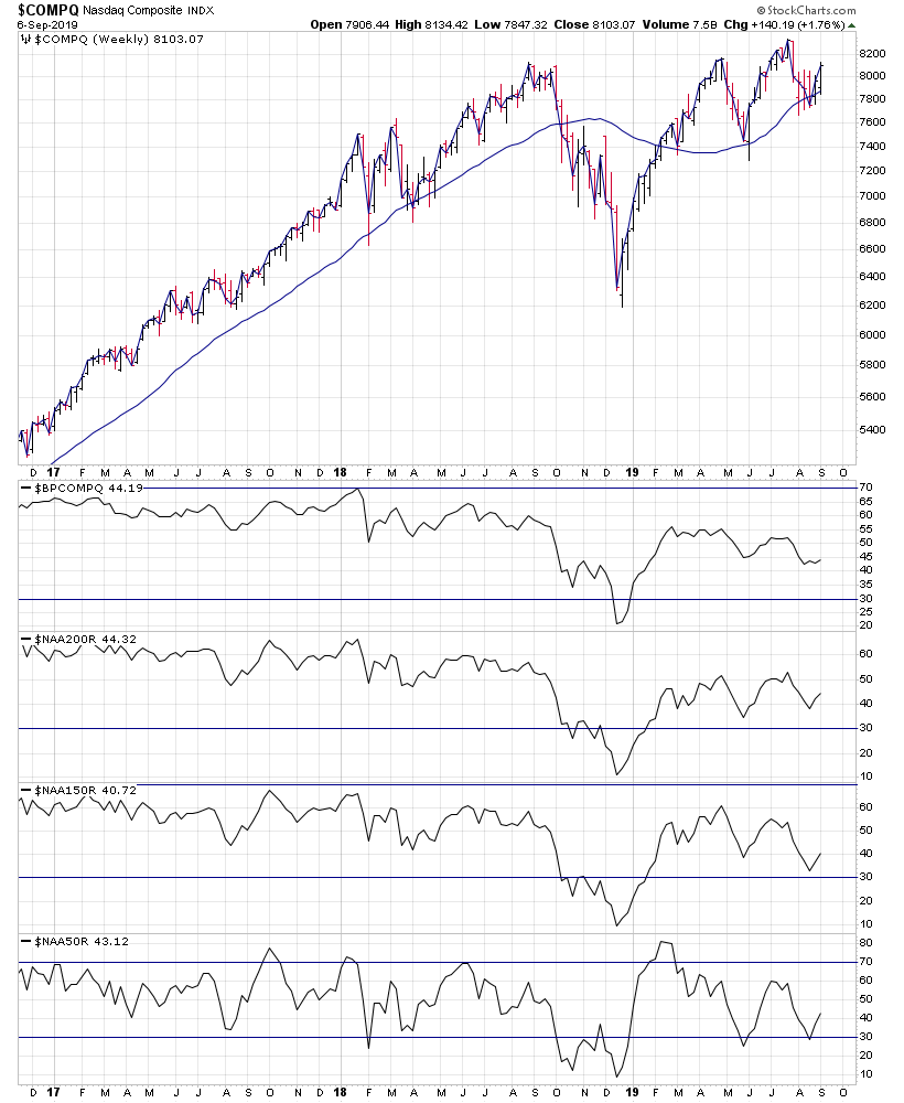 Here are the weekly overview charts of the NYSE, Nasdaq, S&P 500, DJIA & S&P 600 small caps with their US Bullish Percent and Moving Average Breadth.