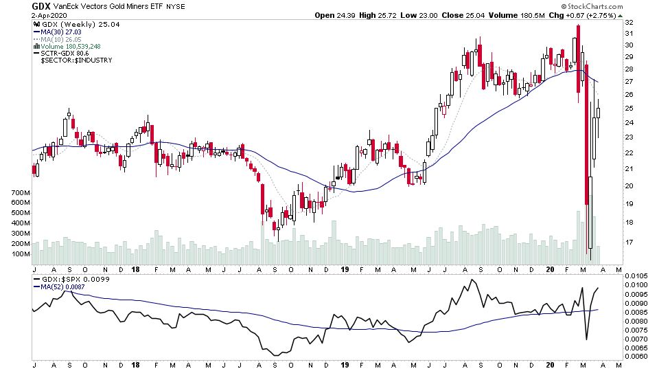 RE: Stan Weinstein's Stage Analysis and Market Breadth - Technical AnalysisRE: Stan Weinstein's Stage Analysis and Market Breadth - Technical Analysis(2020-04-02, 09:26 PM)pcabc Wrote: Another batch with strong relative strength So what themes are you seeing from all of these charts? As I'm trying to get to the potential themes that people are seeing emerging that I might not have, as it's easy to run scans. But I want people to go into more depth and find the hot sectors that might be the next leaders when the Stage 4 decline is over. For example in October/November 2008 the precious metals bottomed around 4 months before the market did, and then metals miners had some huge moves, while the market was still declining in Stage 4. So as history likes to repeat itself, one area I'm looking at currently is the precious metals miners, as they have been showing some very strong relative strength and the GDX etf that covers the larger gold / precious metals miners has rebounded over 50% from its lows in just 3 weeks, and so has the potential to bottom earlier than stocks which haven't shown anywhere near that kind of strength. So that is what mean by a potential theme. What I want to know is what people are seeing, and the reasoning behind it. What areas are standing out ignoring the obvious pharmaceuticals and health care stocks.