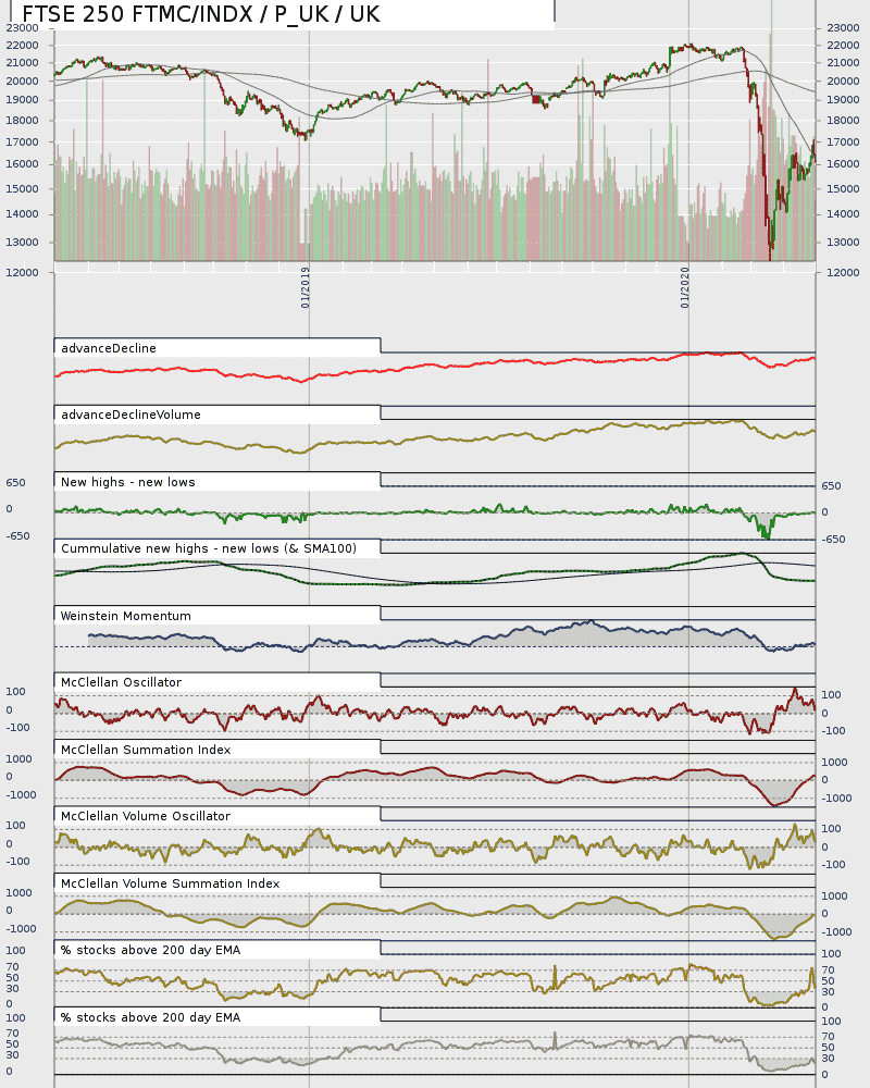 I've noticed some blips in my breadth charts for the percentage of stocks above the 50 day EMA.  I've seen this in a number of charts but it shows particularly well in this one.  You can see the blip labelled near the bottom right hand corner of the chart.  I did wonder if such blips I had seen were owing to issues with my calculations, which is a significant possibility.  You also need to note that the breadth data here is from only 21 stocks - UK sectors are quite small.  However, I think not, you can see the index where it has risen above the 50 day SMAs and is now moving sideways.  I note two different average types - I won't go into the reasons here, they are not trivial and the 50 day EMA and 50 day SMA are close but definitely not identical.  Point is, a number of the index are looking similar to the index.