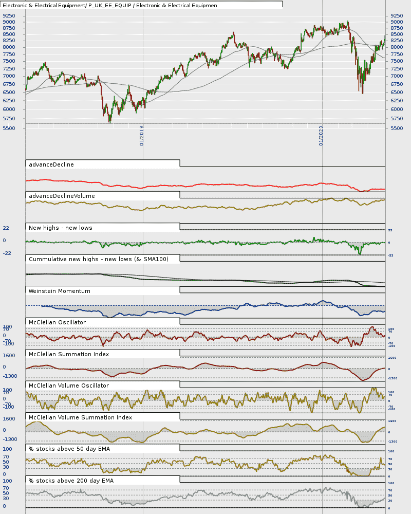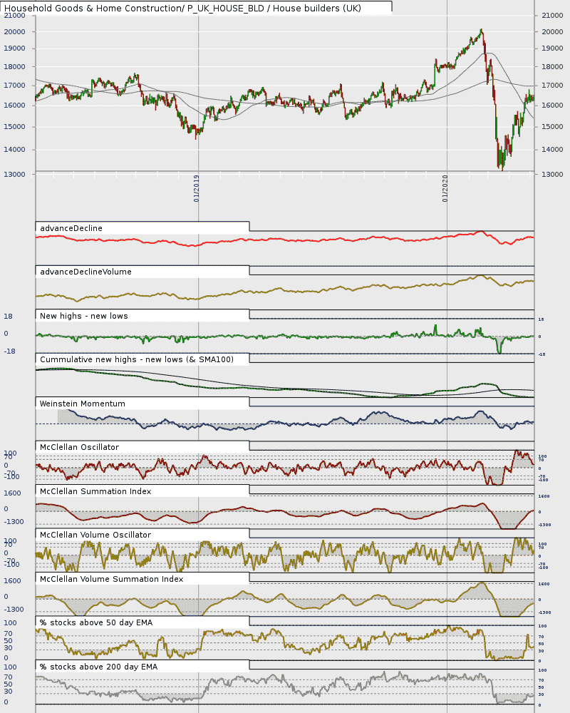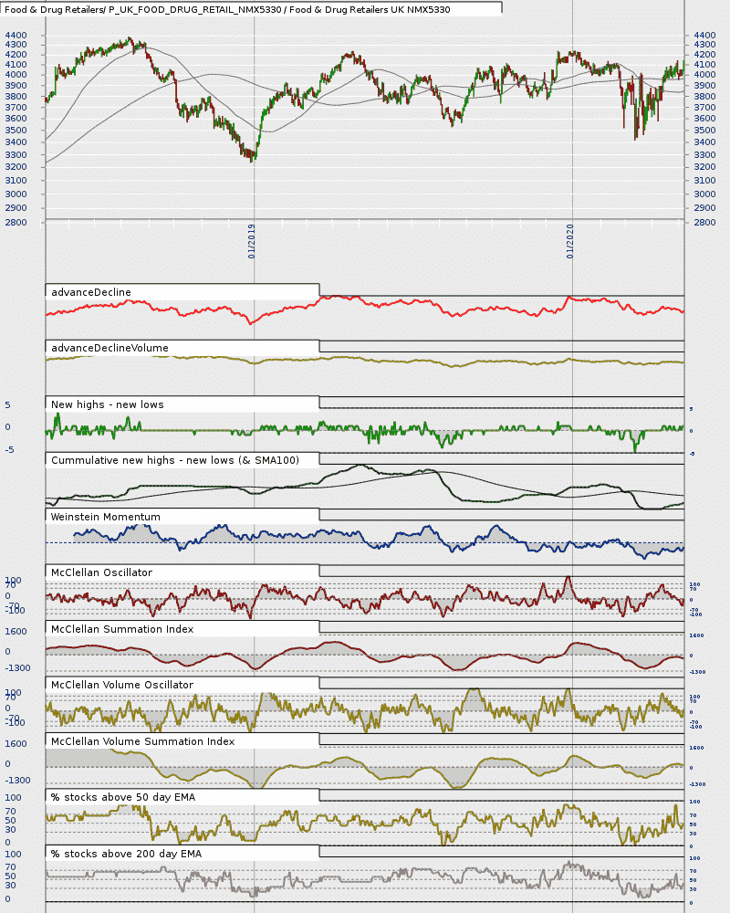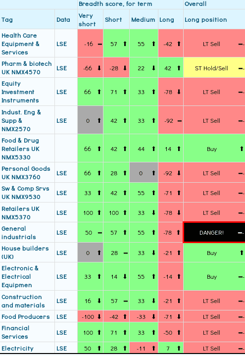 The strongest sectors appear to be Food & Drug retailers, House Builders and Electronic & Electrical Equipment.  However, at best they appear to be going sideways so perhaps they are the best of a weak bunch?