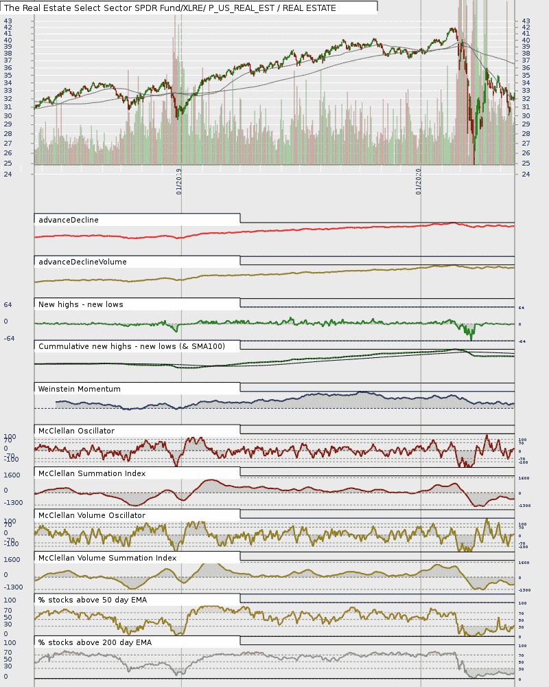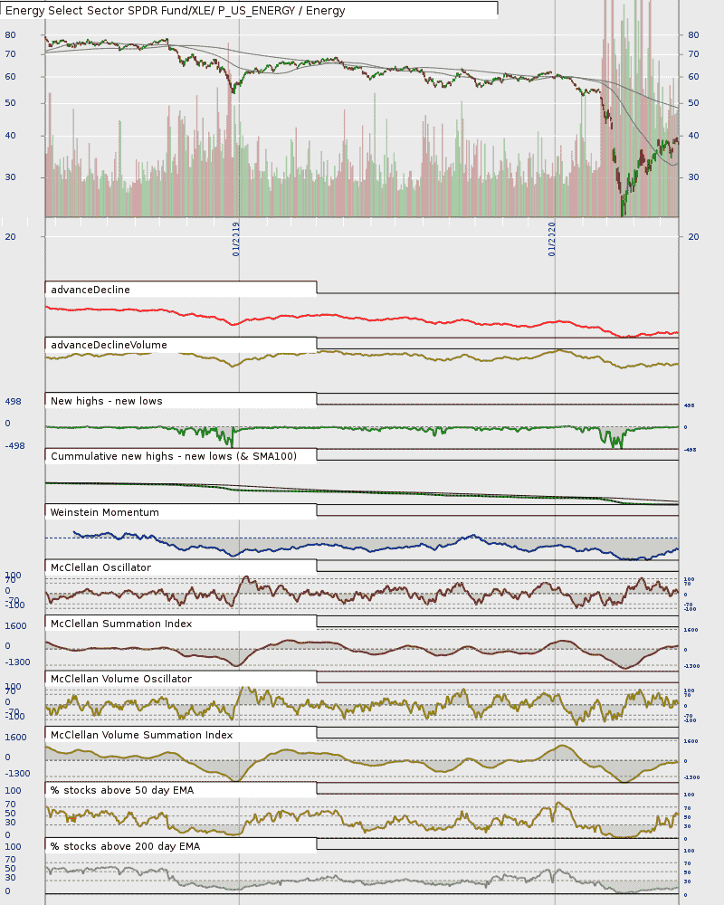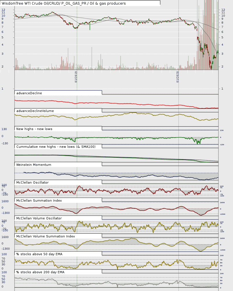 For oil & gas producers, the price of WTI cruse is on the 50 day EMA, the % stocks above the 50 day EMA is now around 50% but the % above the 200% is near zero.    THe McClellan Summation index and its volume counterpart have just poked above zero.  But its still very much stage 4.