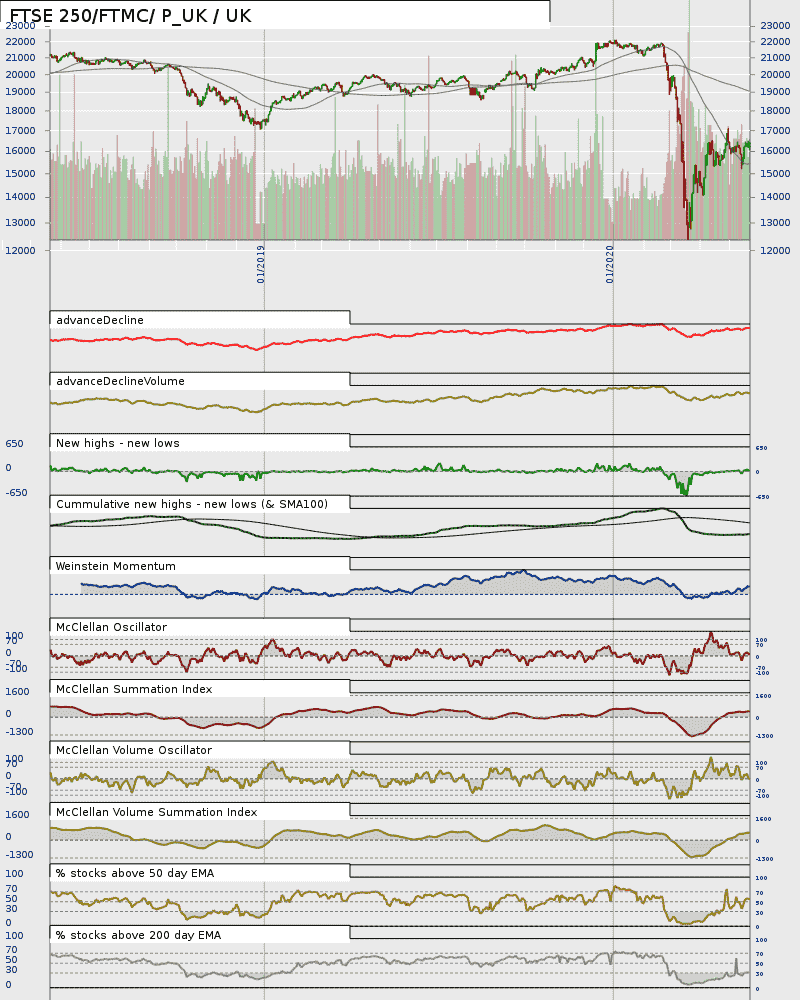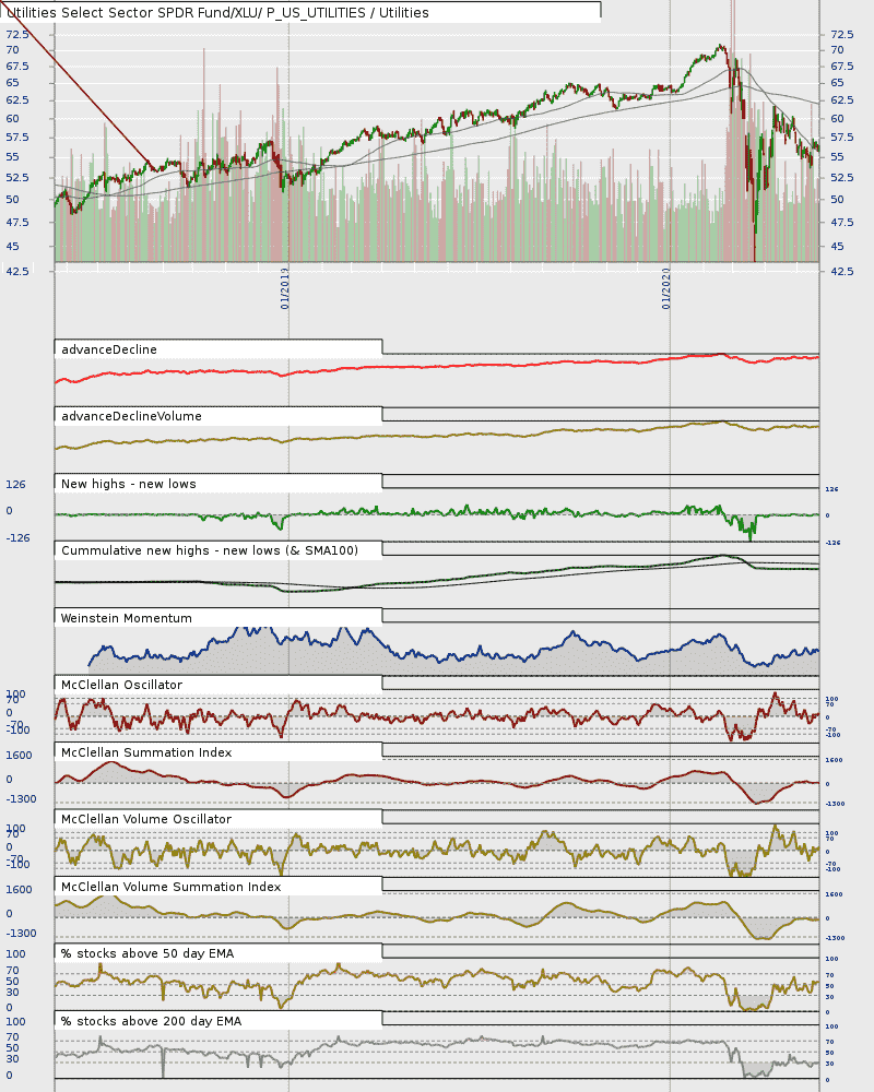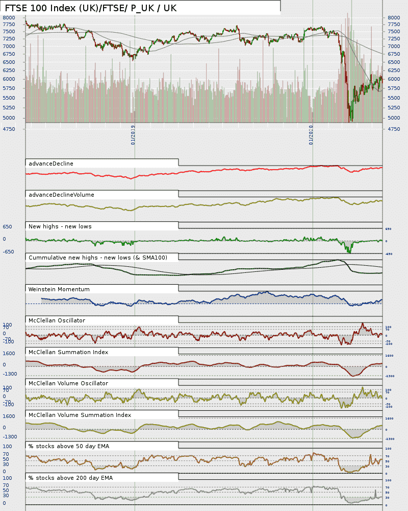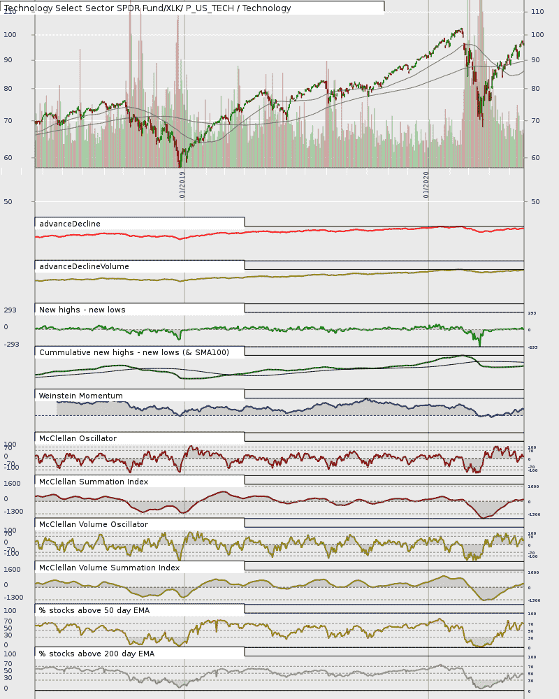 The advance / decline lines, new-highs minus new-lows, % stocks above the EMA and Weinstein momentum show strengthening bu the McClellan oscillators are doing a downward cross though their zero lines and the index is definitely in a stage 4.