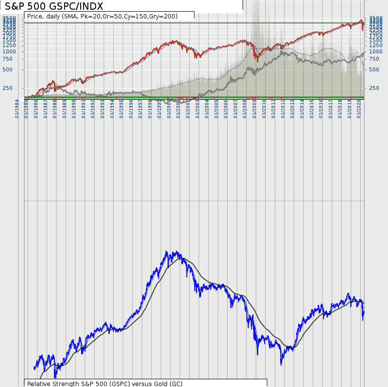 When, on the bottom blue plot, the blue line is moving up the S&P500 is stronger than the gold price.  When it is moving down the opposite is true.