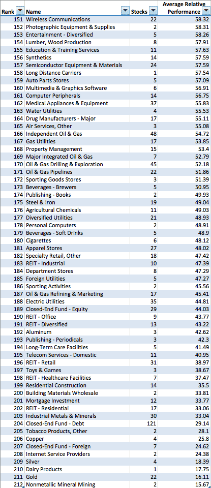 An important part of Weinstein's Stage Analysis method is sector analysis, so attached is the relative strength lists of the US sub sectors that have available on chartmill.com - which I've ordered by strongest to the weakest sectors currently.