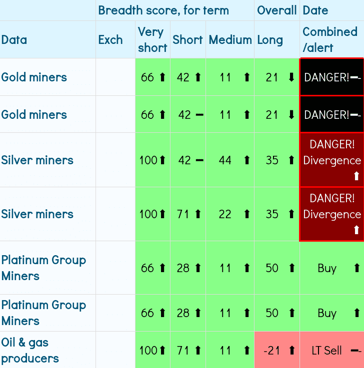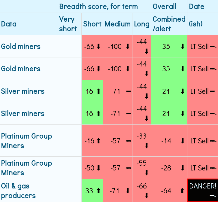 For gold & silver, and there miners we are seeing an uptick in breadth.  But my danger warnings, that I have based on NYSE behaviour running up to the 1987 crash, are flashing danger.  These warnings are quite complex - but what seems to be causing the warning here is the relationship between the Weinstein momentum and various averages of it, the relationship of new highs versus new lows and a couple of its averages, percentages of stock above their 50 and 200 day SMAs.  Having been developed against the NYSE I'm not sure whether this is applicable against miners, but on the other hand it is not an indication of strength.  I'm miners improve this could reverse.  But if stocks are on the up as a whole there is less reason for gold and silver, and their miners, to strengthen.