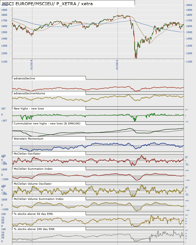 For the UK both the FTSE 100 and 250 have had their 150 MAs flatten out and are now rising.  The same is true of the DAX and the indicies are all above their MAs.  No higher lows and higher highs yet.  For the UK the A/D line is making a new high.  All have Weinstein momentums above zero, though they have been falling but the number of stocks above the 50% and 200% EMAs, for all are above 50%.  OF couse there is always the danger that there is an error in my calculations, but the change of the rising 150 day MAs being incorrect is quite low.