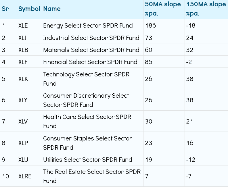 I think energy showed up so strongly in the momentum plot on my previous post owing to the slope of the 50 day MA line. However, it looks like energy is firmly in stage 1 now.  Looking at the price only tech, materials and healthcare look like they are ones to look for with continuations.