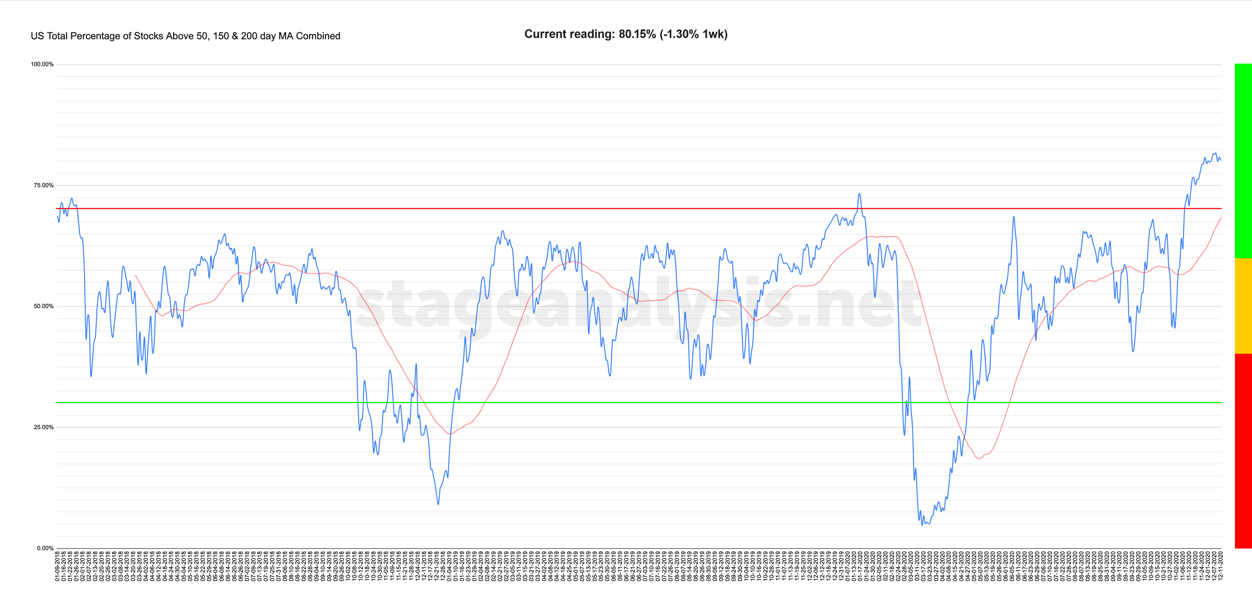 US Total % Stocks Above their 50 Day, 150 Day and 200 Day Moving Averages = 80.15% (-1.30% 1wk)