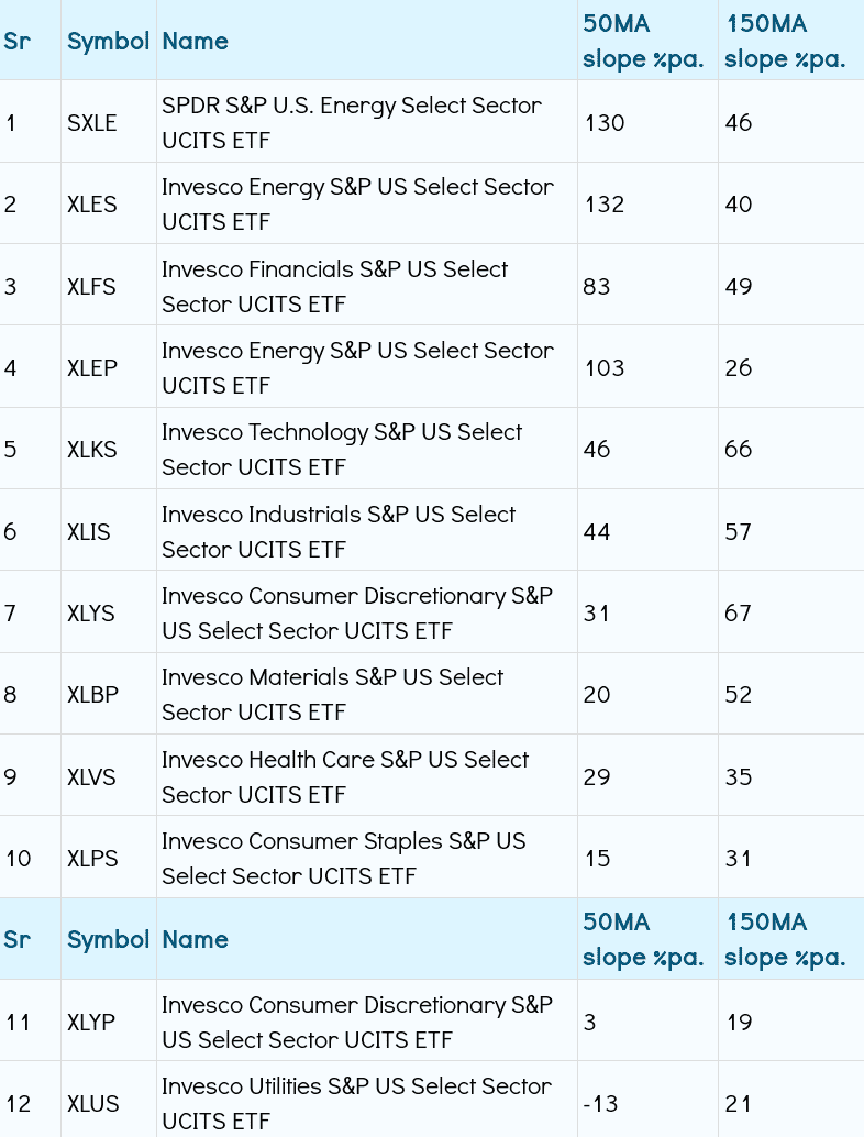 I think energy showed up so strongly in the momentum plot on my previous post owing to the slope of the 50 day MA line. However, it looks like energy is firmly in stage 1 now.  Looking at the price only tech, materials and healthcare look like they are ones to look for with continuations.
