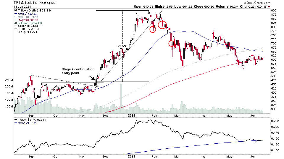 Fate does not always let you fix the tuition fee. She delivers the educational wallop and presents her own bill - Reminiscences of a Stock Operator. RE: Stan Weinstein's Stage Analysis and Market Breadth - Technical Analysis(2021-06-12, 10:26 AM)isatrader Wrote:This is an interesting chart. Not sure if I'm going a little off topic - or whether this example is atypical. However, if I got in on a continuation at 700 then getting out at 750 (A) the 50 day SMA, would get a profit of 7%. Waiting for B would get you out at about 650, probably a little lower, minus 7% assuming that you ignored the intraday fluctuations and only sold based on the close. The 200 day sell would be around 580 minus 17%. I appreciate this may not be the best example of a continuation with not very good volume. However it would seem that you might need to be quicker to sell if going for this sort of opening? Perhaps better continuations perform better? Also, if you are going to sell at a 7% profit you need to ensure you have costs under control.(2021-06-12, 07:01 AM)JimStudent Wrote: I was surprised listening to Stan's Interview that he had moved to the 200 Day Moving Average instead of the 150 Da Moving Average. I am rearranging the charts I have. And, I would love to listen to the Financial Series interviews. I think I have only heard one of them. RE: Stan Weinstein's Stage Analysis and Market Breadth - Technical Analysis(2021-06-12, 12:48 PM)pcabc Wrote: This is an interesting chart. Not sure if I'm going a little off topic - or whether this example is atypical. However, if I got in on a continuation at 700 then getting out at 750 (A) the 50 day SMA, would get a profit of 7%. Waiting for B would get you out at about 650, probably a little lower, minus 7% assuming that you ignored the intraday fluctuations and only sold based on the close. The 200 day sell would be around 580 minus 17%. I appreciate this may not be the best example of a continuation with not very good volume. However it would seem that you might need to be quicker to sell if going for this sort of opening? Perhaps better continuations perform better? Also, if you are going to sell at a 7% profit you need to ensure you have costs under control. They are Investor method exit points. Trader method has always been get out much quicker and to sell into strength. Mostly at the 50 day MA break or valid trend line break (3 touch points) or even earlier on sign of a buying climax or market weakness. Also where you highlighted is not an entry point for either of the Stage Analysis methods, as only a minor continuation with no base. The entry point for TSLA would have been on the 18th Nov for the trader method. So would have been between 50% to 90% trade depending on how you exited.