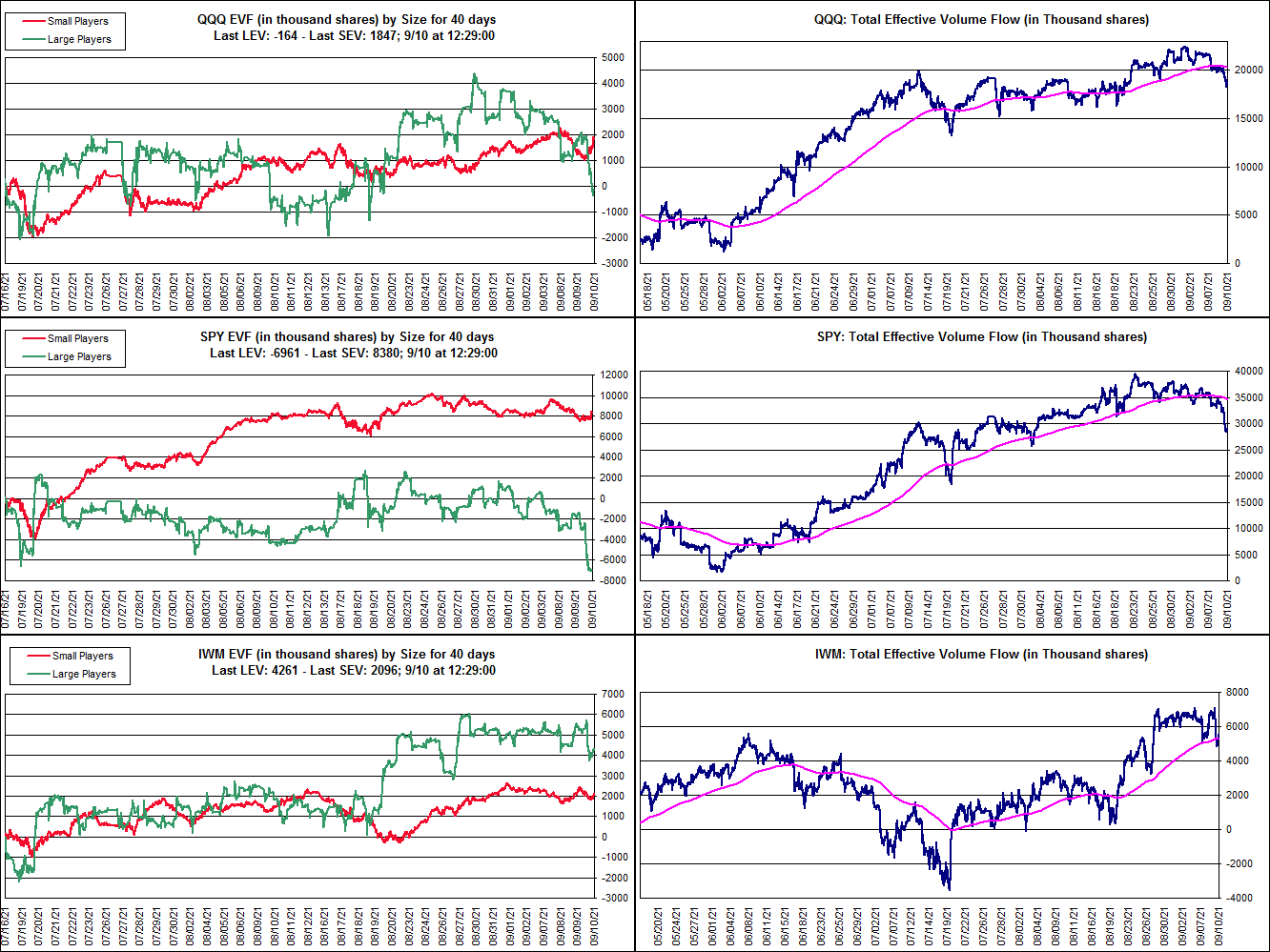 I think it's clear that there has been a shift over the last week with more large player selling in the QQQ and SPY - which has taken the total effective volume flow below its 20 day MA in the QQQ and SPY, but IWM small caps is still holding up. So QQQ and SPY have turned negative and the IWM is around neutral currently.