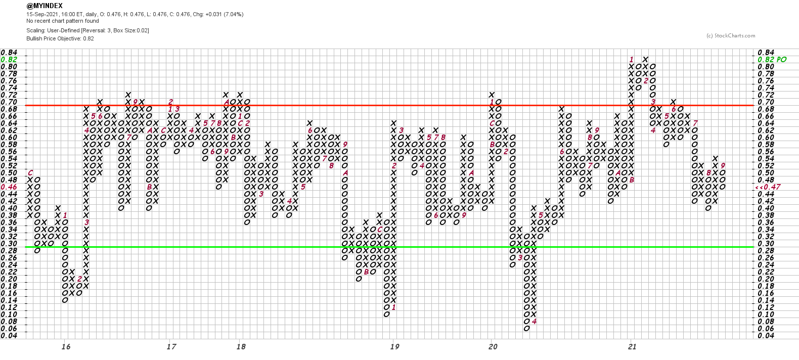I've managed to get the data into a custom chart in my stockcharts and so I can now view it as a P&F chart as well, and hence it can be used in the same way as the Bullish Percent Index with statuses and in terms of Column of Xs means playing an Offensive strategy and a Column of Os means playing Defensive strategy