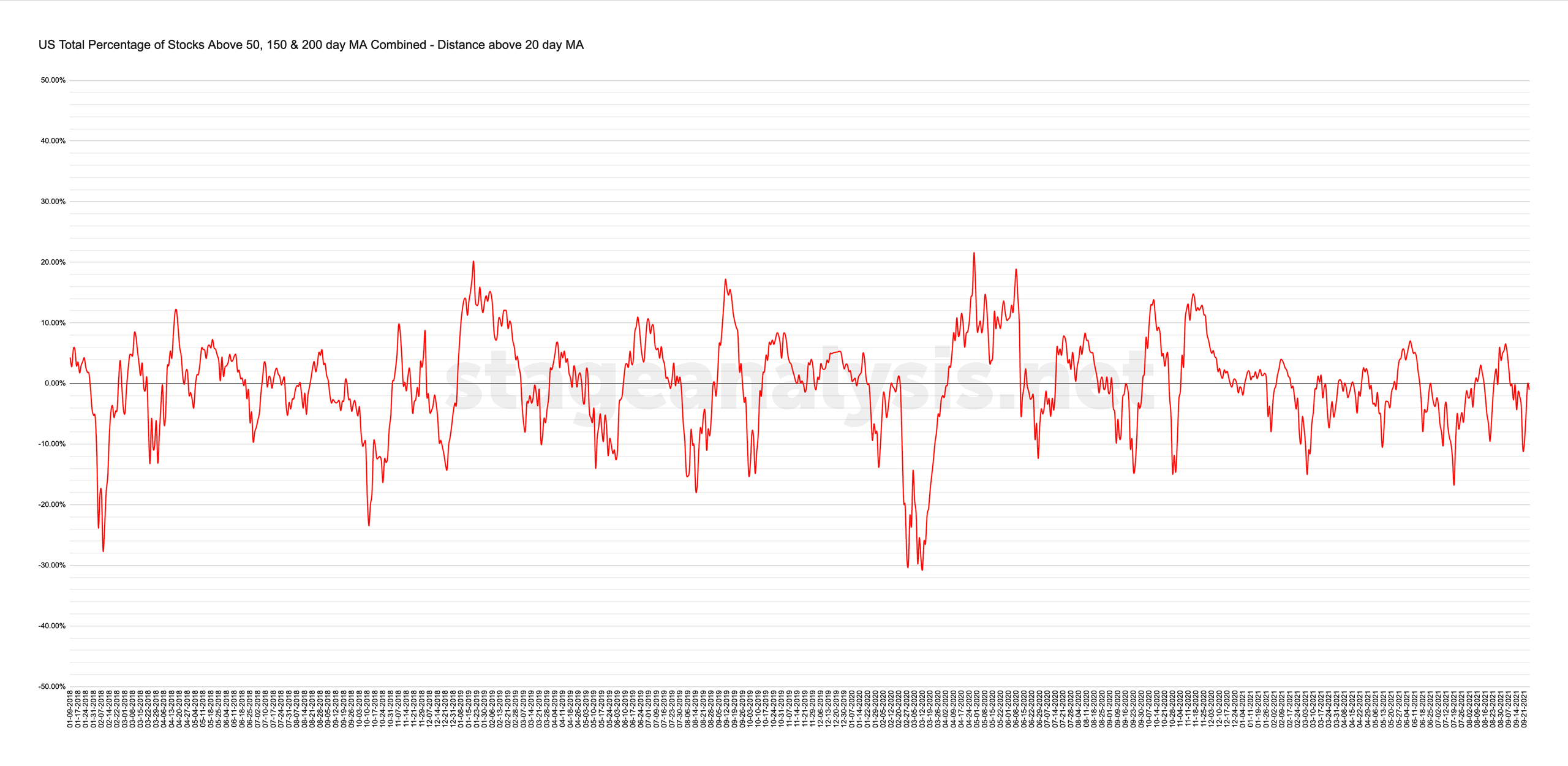 Exclusive US Total % Stocks Above their 50 Day, 150 Day & 200 Day Moving Averages Combined Chart