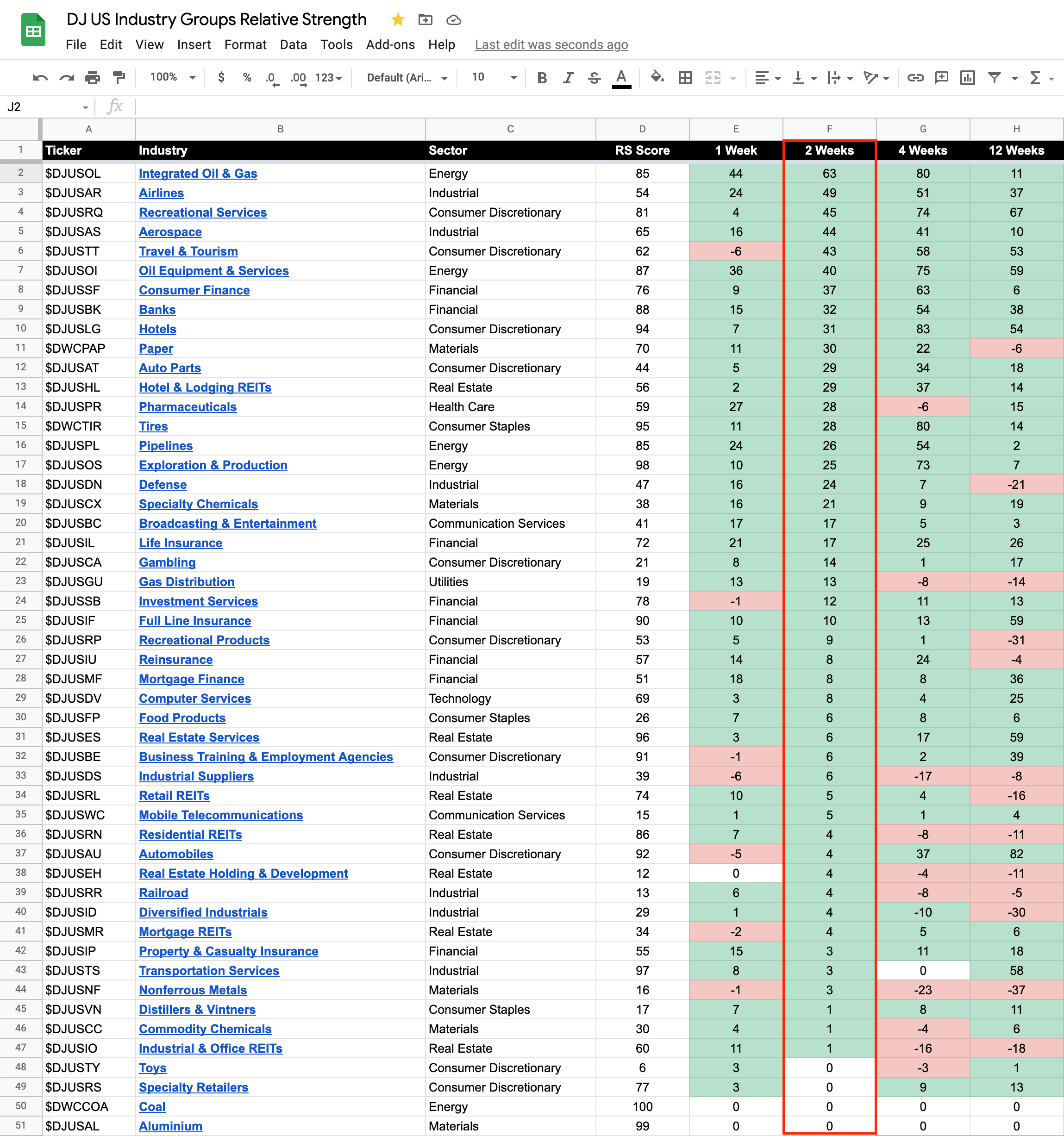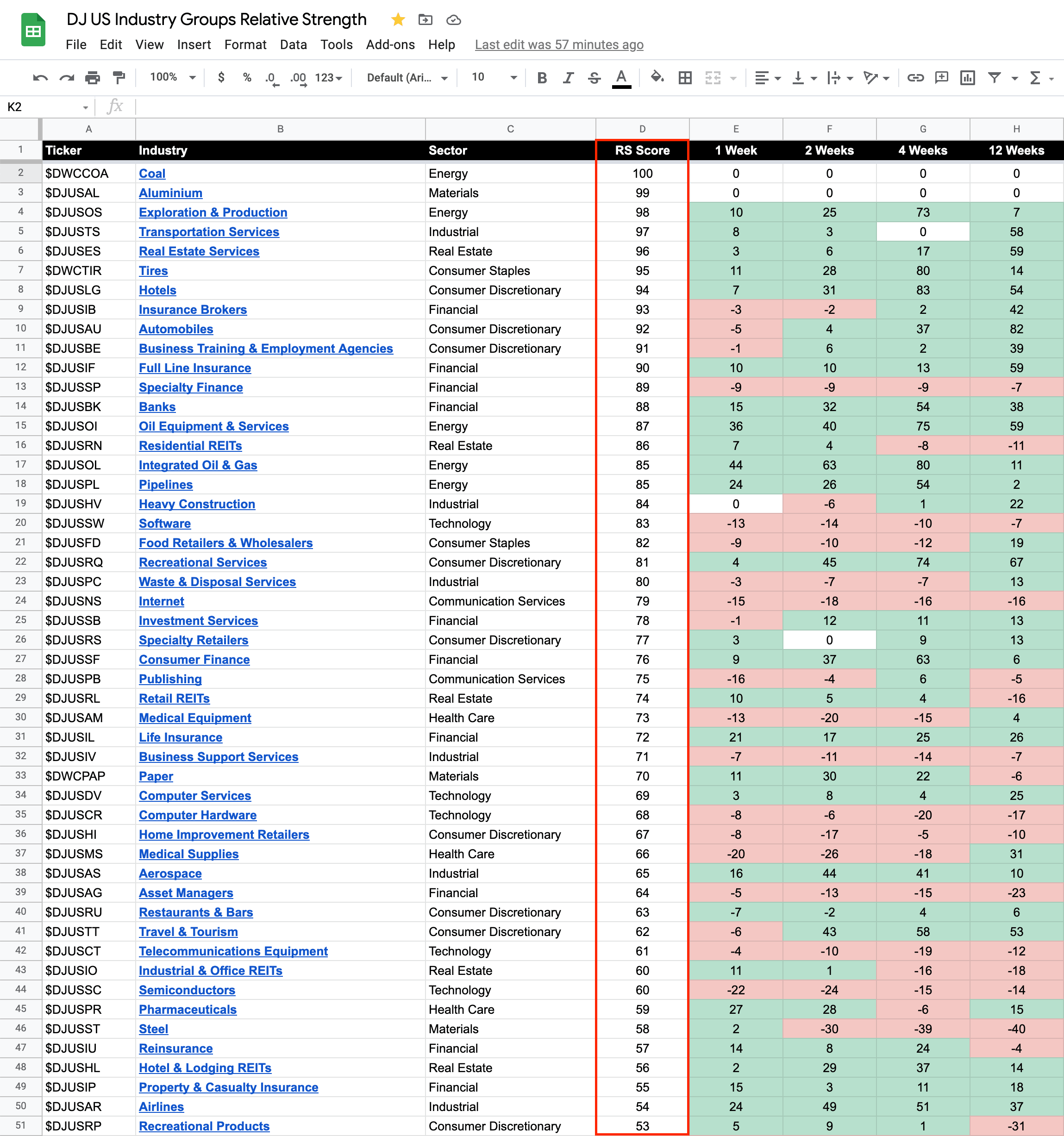 104 Dow Jones Industry Groups sorted by Relative Strength