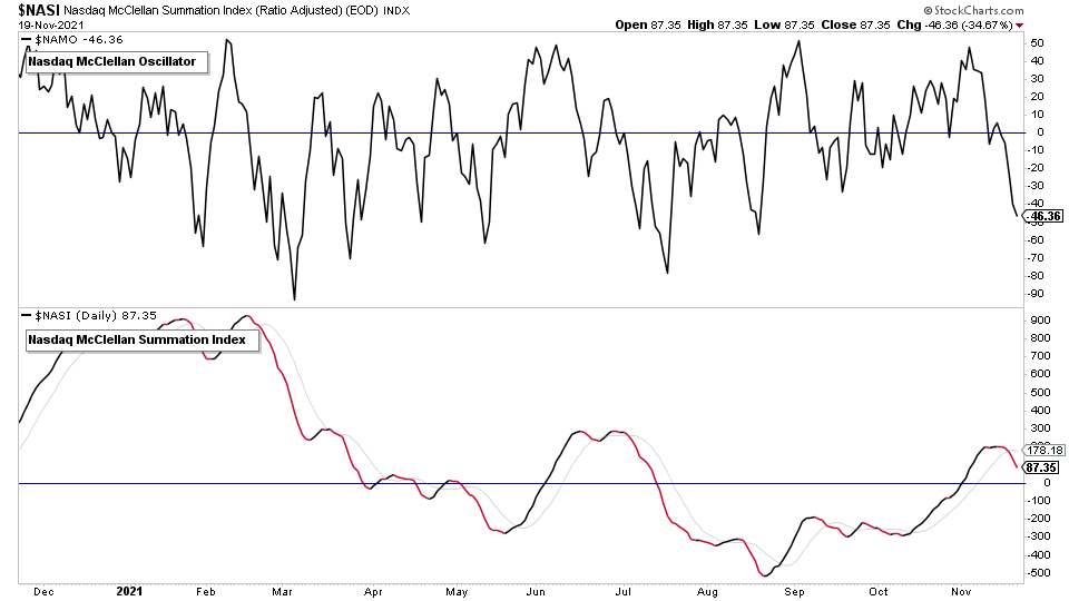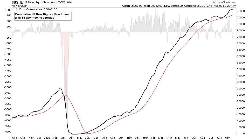 US New Highs - News Lows moved back to neutral / negative territory on Friday with a close below the zero line, and the Nasdaq especially with a larger amount of new lows compared to new highs appearing.