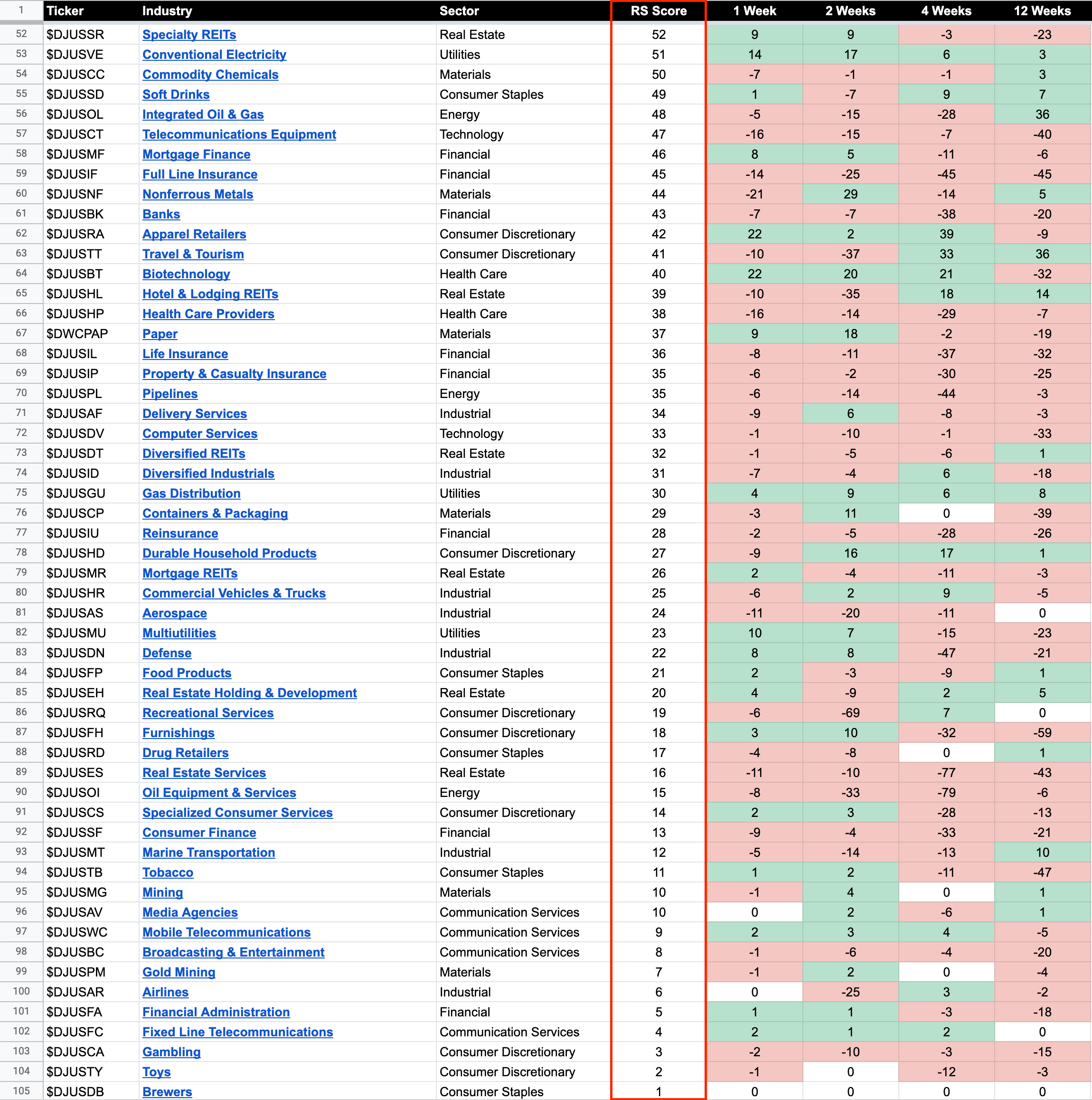 104 Dow Jones Industry Groups sorted by Relative Strength
