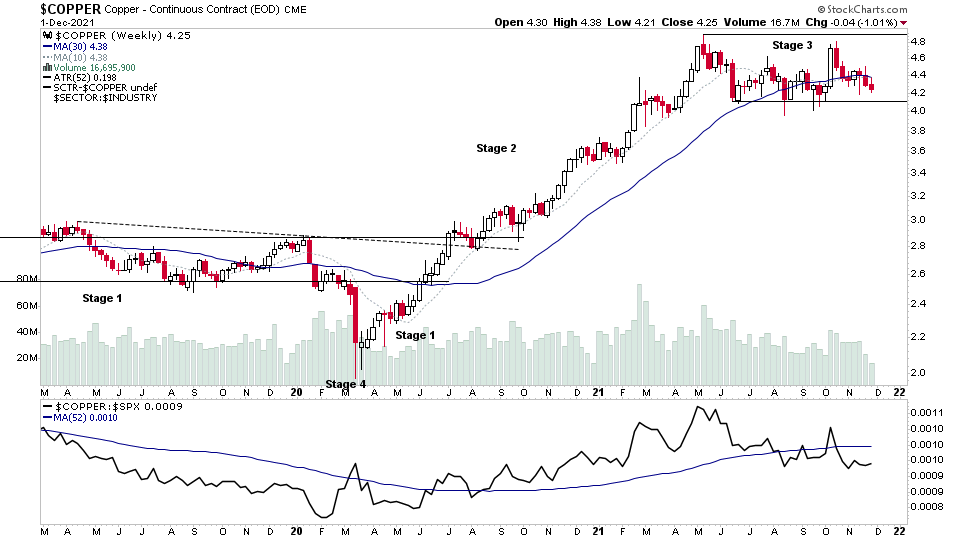 Copper forming in late Stage 3 following a failed continuation breakout attempt within the broader range which has formed as an upthrust & test. Approaching pivotal point, potential for Stage 4 attempt.