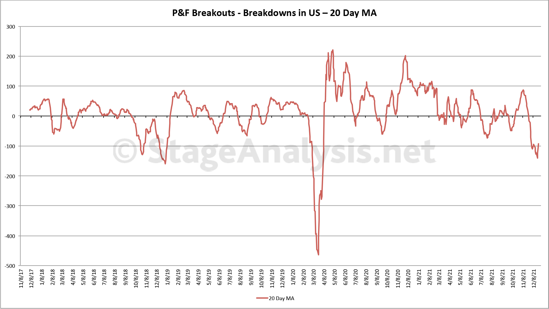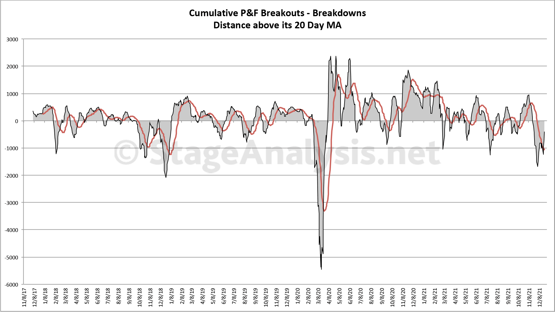 Cumulative Point & Figure Breakouts - Breakdowns Distance Above / Below its 20 day MA