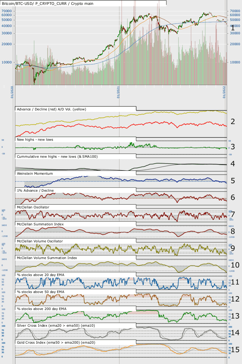Basically nearly every indicator is negative, with New Highs - New lows, 3, having been negative for a while such that the cumulative plot of these parameters has also been below its 100 day MA, 4, for a while.  Weinstein Momentum, 5, and 1% A/D, 6, have been negative for some weeks too.  There are only two bullish signs, 1, the 150 day SMA for Bitcoin is still rising, 1, and the Silver Cross Index, 14, is also rising.  Everything else is bearish.  You could argue that some indicators are oversold, but looking at history some indicators can be oversold or overbought for long periods, so I'd not take, for example, the % stocks above their 50 day EMAs, being below 30% as being particularly bullish.