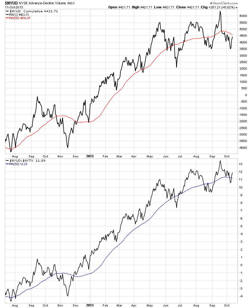The NYSE Advance Decline Volume is testing the August swing low, and the moving average has turned down over the last few weeks for the first time since November 2012.