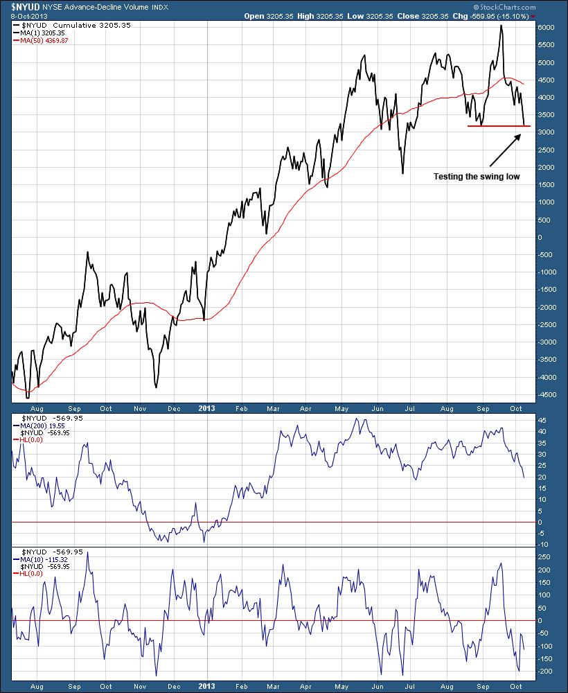 The NYSE Advance Decline Volume is testing the August swing low, and the moving average has turned down over the last few weeks for the first time since November 2012.