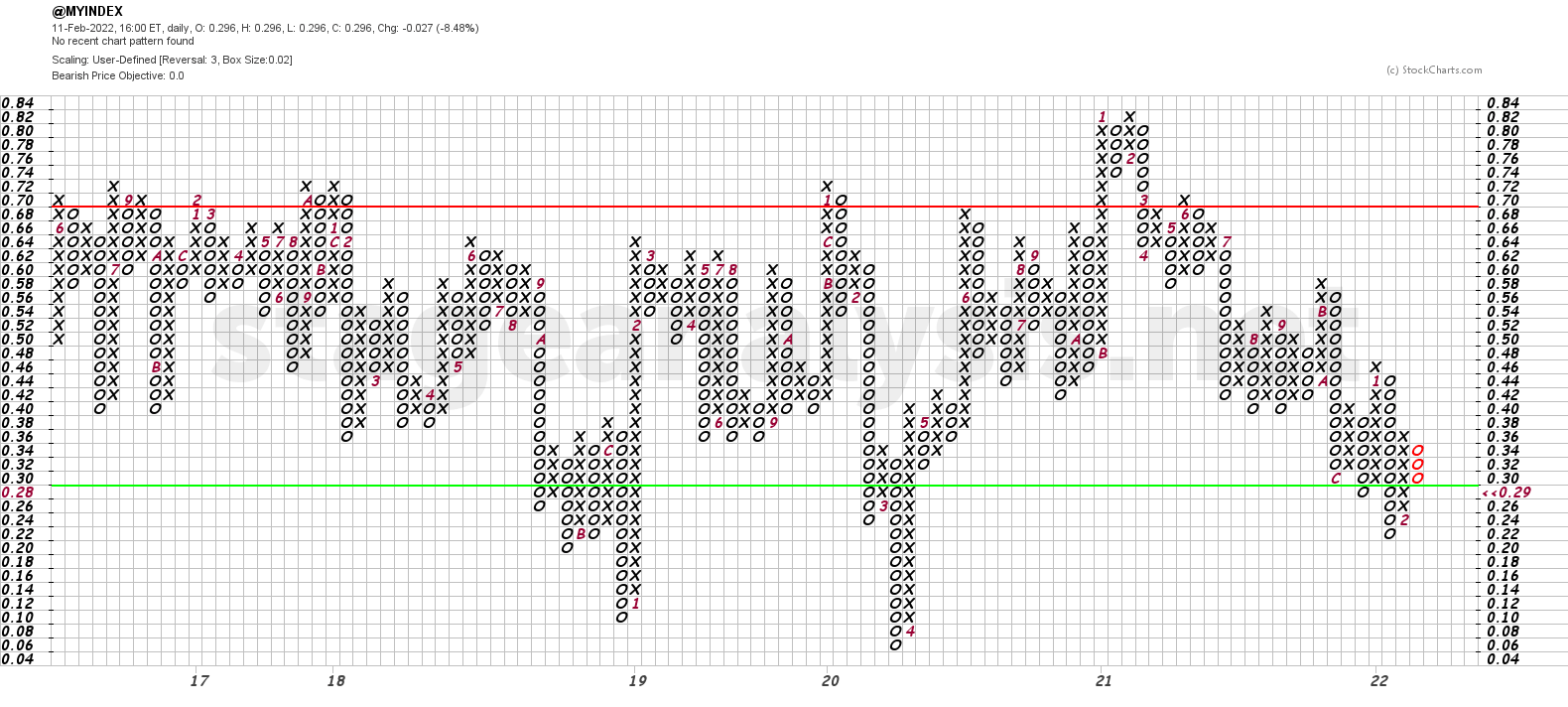 Reversal back to a column of Os, so flips back to Bear Confirmed status, but with a lower pivot point for the next potential double top breakout, which it would need to break the 38% level to reach now.