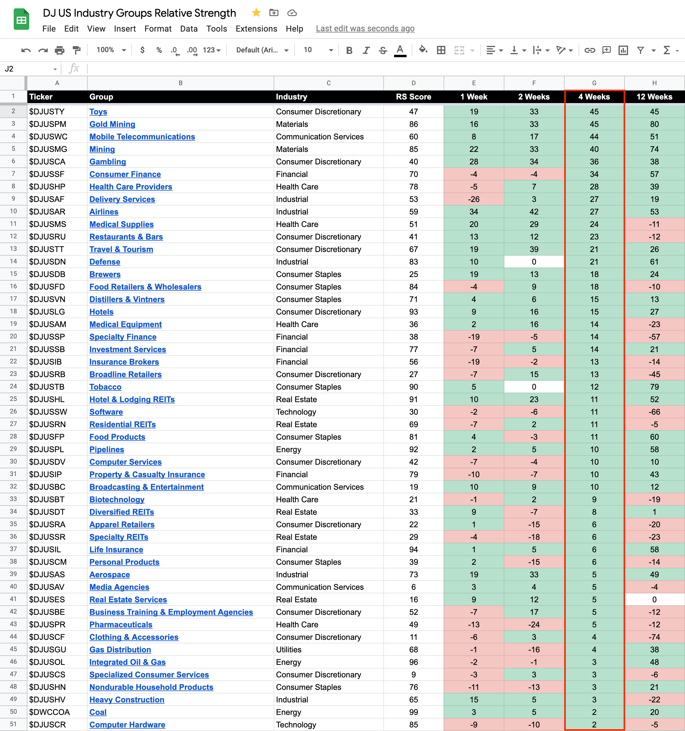 104 Dow Jones Industry Groups sorted by Relative Strength