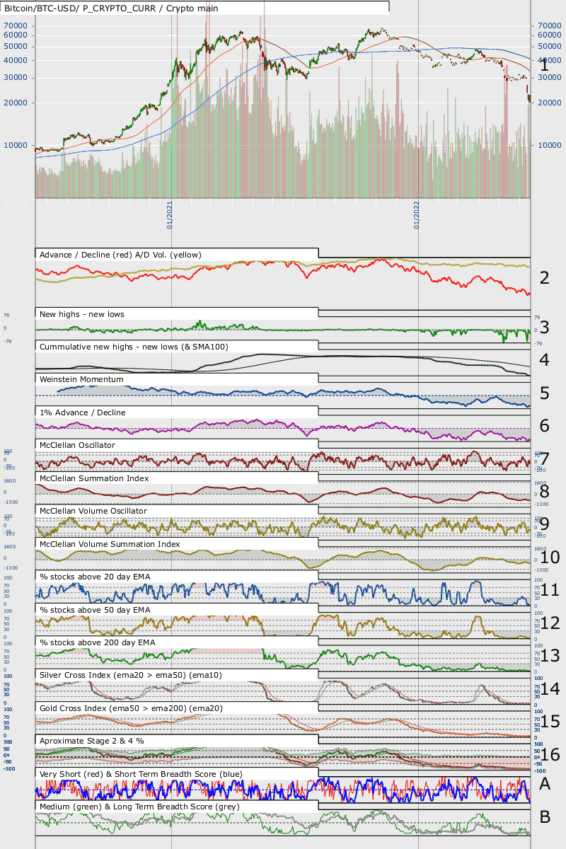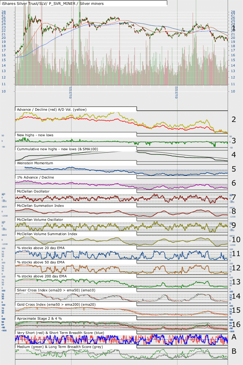 % stocks above their MAs, Silver and Giold Cross Indicies are all headed, or have headed, down [11-15]. New lows still dominate [3]. Also downward slope of 50 and 150 day SMAs [1] are accelerating. I wonder if we are heading for a crash as in 2008 where markets were at Stage 4 for quite a while before the big downward moves?