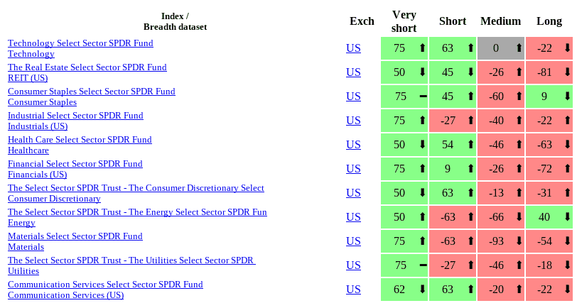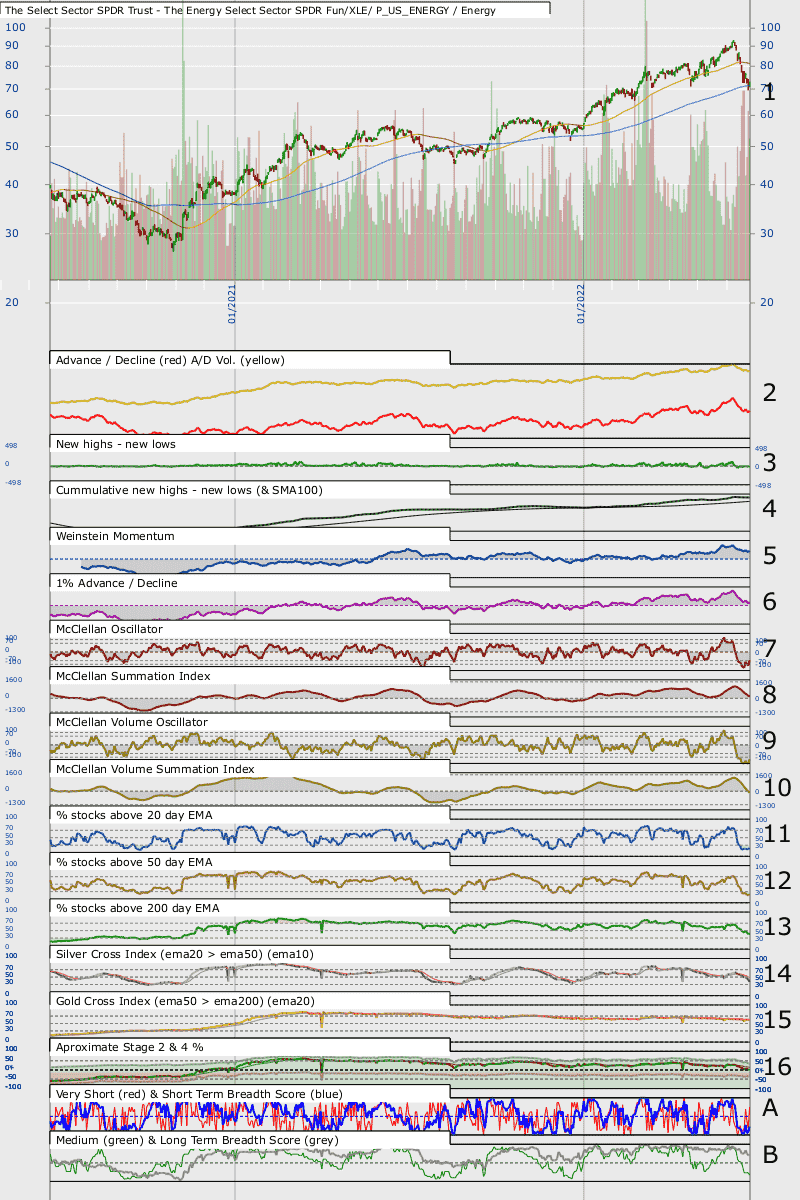 Energy, sharp pullback [1] just a lower low, but would want to see more to call it a breakdown. % stocks above their EMAs and the Silver Cross Index [11-14] have all dipped. The rest is relatively bullish.