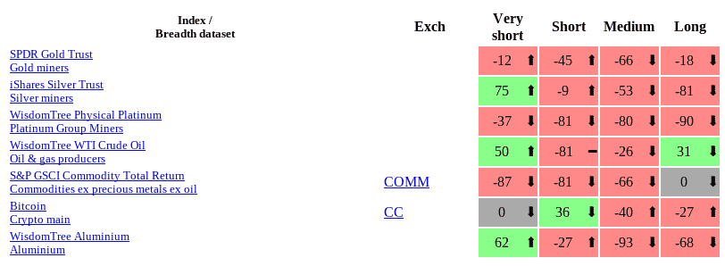 Precious metals against their miners is generally weak. I'll have to post a breadth chart for silver though. Crude against Oil and Gas producers is similar to the US Energy sector, as would be expected. Bitcoin verus crypto breadth is weak. The mid and long term scores risking indicate strengthening, but its not so obvious in the charts which I'll have to plot later.
