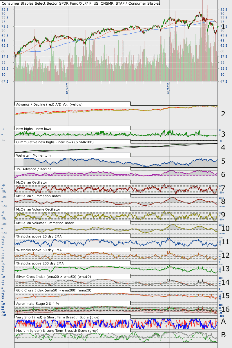 Consumer staples, index in Stage 4 [1], Silver [14] and Gold [15] Cross Indicies have taken a dive as have the % stocks abouver their MAs [11-13].