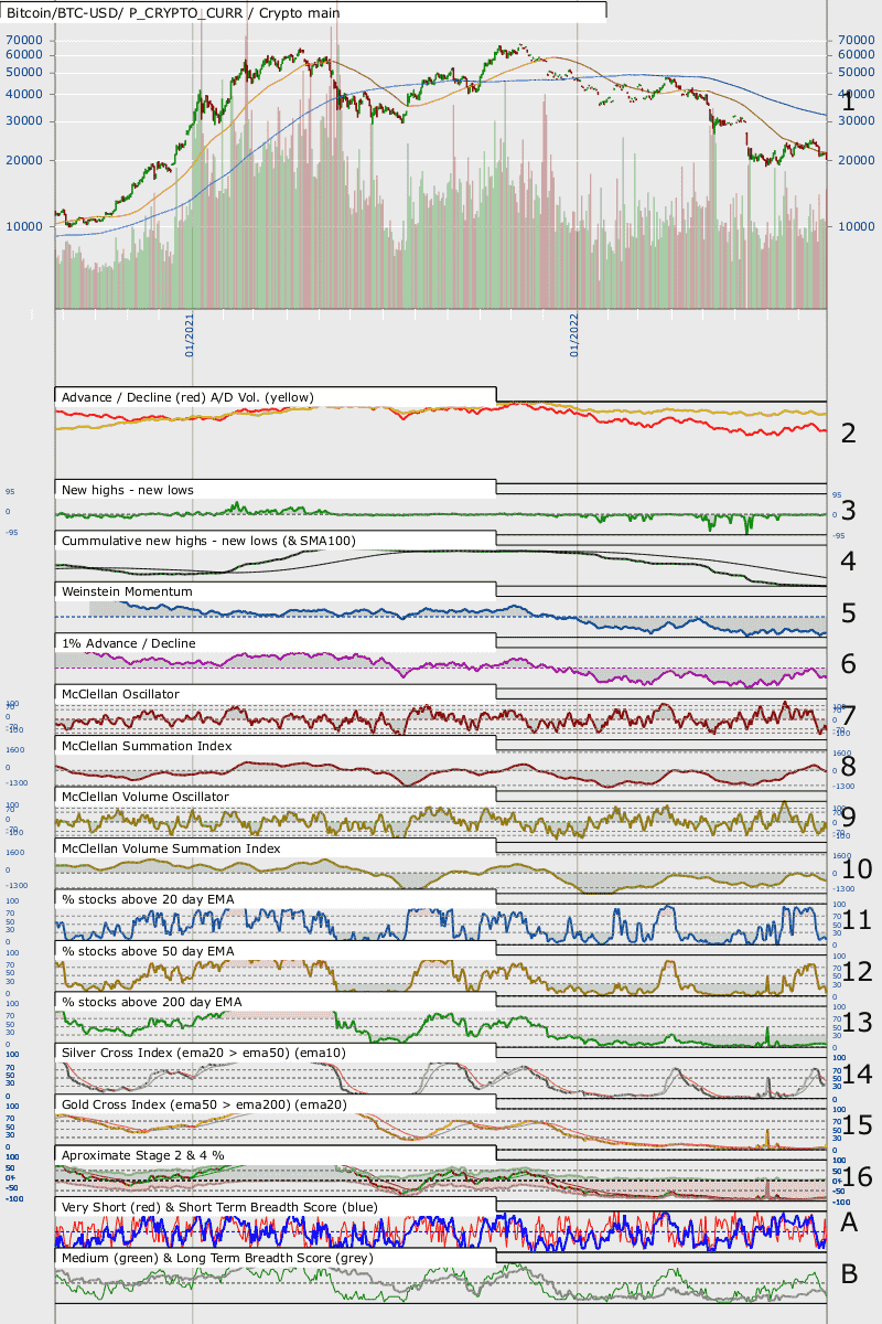 The S&P500 has bounced off the red resistance line and is dropping despite showing earlier signs of strength when it broke through the blue one [1]. Having strengthened over the last approx six weeks in the short term at least the breadth indicators have weakened. The silver cross indicator [14] is about to drop below its MA. My very short and short term aggregate scores [A] are negative and my medium and long term indicators [B] seemed to have peaked, at least for now. I think that until there is a higher low and the red trendline is broken caution is appropriate - but that's just my view.