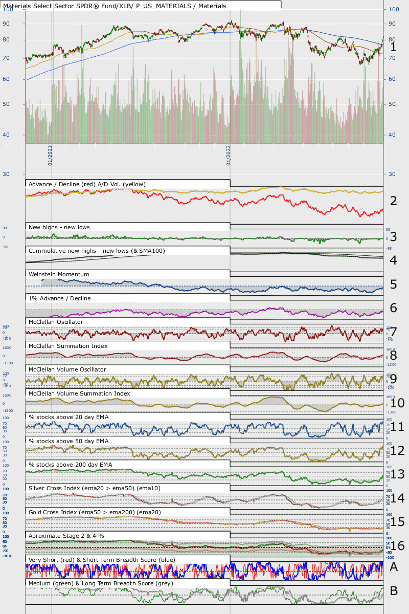 There has been recent strengthening in breadth of gold and solver miners, e.g. % stocks about their 20 and 50 day EMAs [11&12 both charts].  However, without the price [1, both charts] clearly entering Stage 2 then I suspect its just the usual short term strengthening.  Silver may be close to the initial stages of Stage 2, but it is not clear yet.  Gold is weaker.  I'm not seeing much for the miners in my screener.