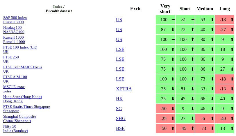 [11, 12 & 13] The % stocks above their 20 and 50 day EMAs has jumped, 20 day is around the 90s, 50 day is above 50%. There is a slgiht twitch in the % above the 200 day, but it is quite low still.