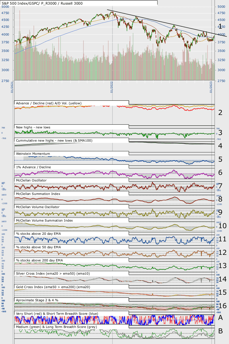 The main thing with the S&P500 is that it is above the down trend that started in the beginning of 2022 [1]. To my eyes 4100 looks significant and it is just below it, so it will be interesting if it pushes through, pauses or drops back down off it. Also worth noting that the Weinstein Momentum [5] and 1% A/D are crossing their zero lines in a bullish direction and the Golden Cross Index [15] is near crossing 50%, so nearly 50% of constituents have their 50 day EMA above their 200 day EMA and that proportion at present is rising. The cummulative New Highs - New Lows line is near crossing above its 100 day SMA which is bullish, it looks like there may be a few new highs, but given the down trend it cannot be many.