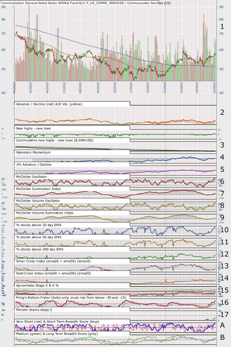 You can clearly argue higher highs and higher lows looking at June, August, September/October, December and March. A longer timescale or 2 years (not shown) makes the 'price' [1] look more like the end point of a longer period of Stage 3 volatility.  If we take August and December as highs then the Advance Decline line [2, red] is diverging negatively, but the Advancing / Declining Volume line [2, yellow] is not.  % stocks about the 20, 50 and 200 day EMA are increasing.  I think that we are seeing the increase in strength as there is the climb out of a low in a volatile sector - but would not like to say much more.